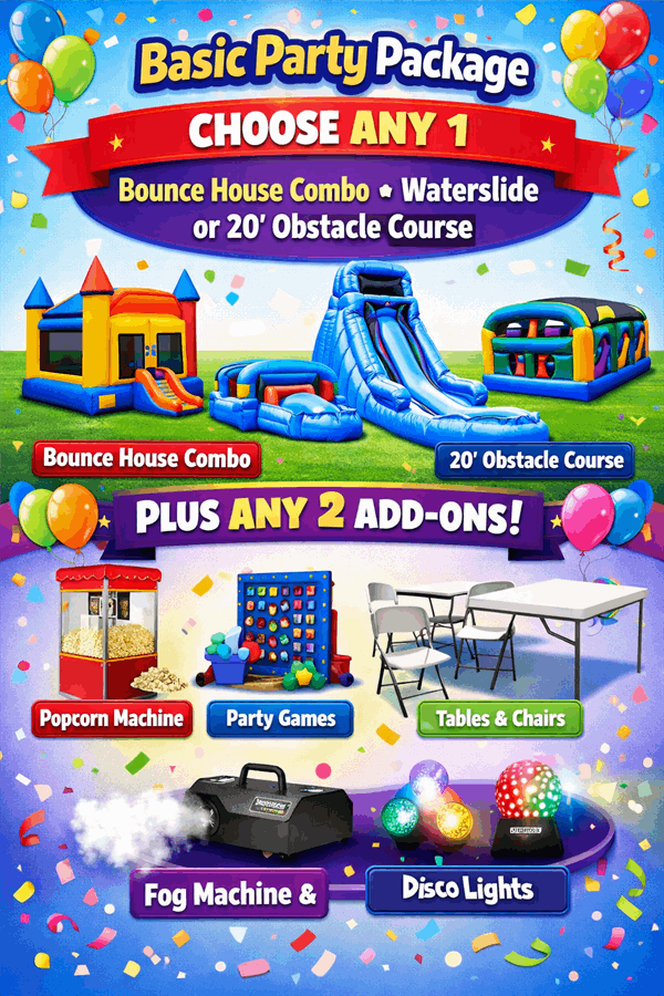 Make your event easy and fun with our Basic Party Package! Choose any 1 inflatable (bounce house, waterslide, or 20' obstacle course) plus any 2 add-ons for a customizable party experience.