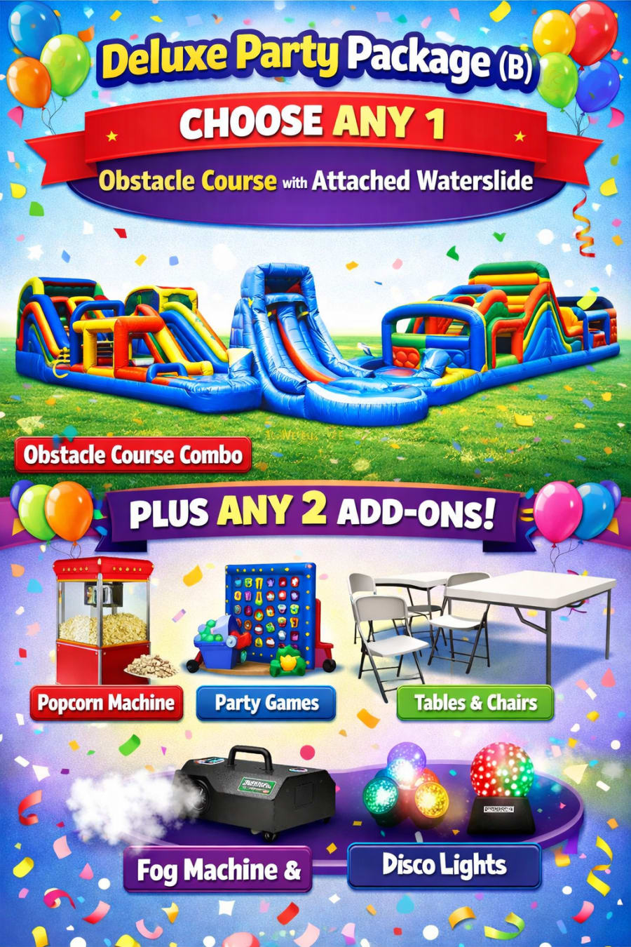 Go big with our Deluxe Party Package (B)! This package includes a 42 ft obstacle course with attached waterslide plus any 2 add-ons for an action-packed, high-energy event.