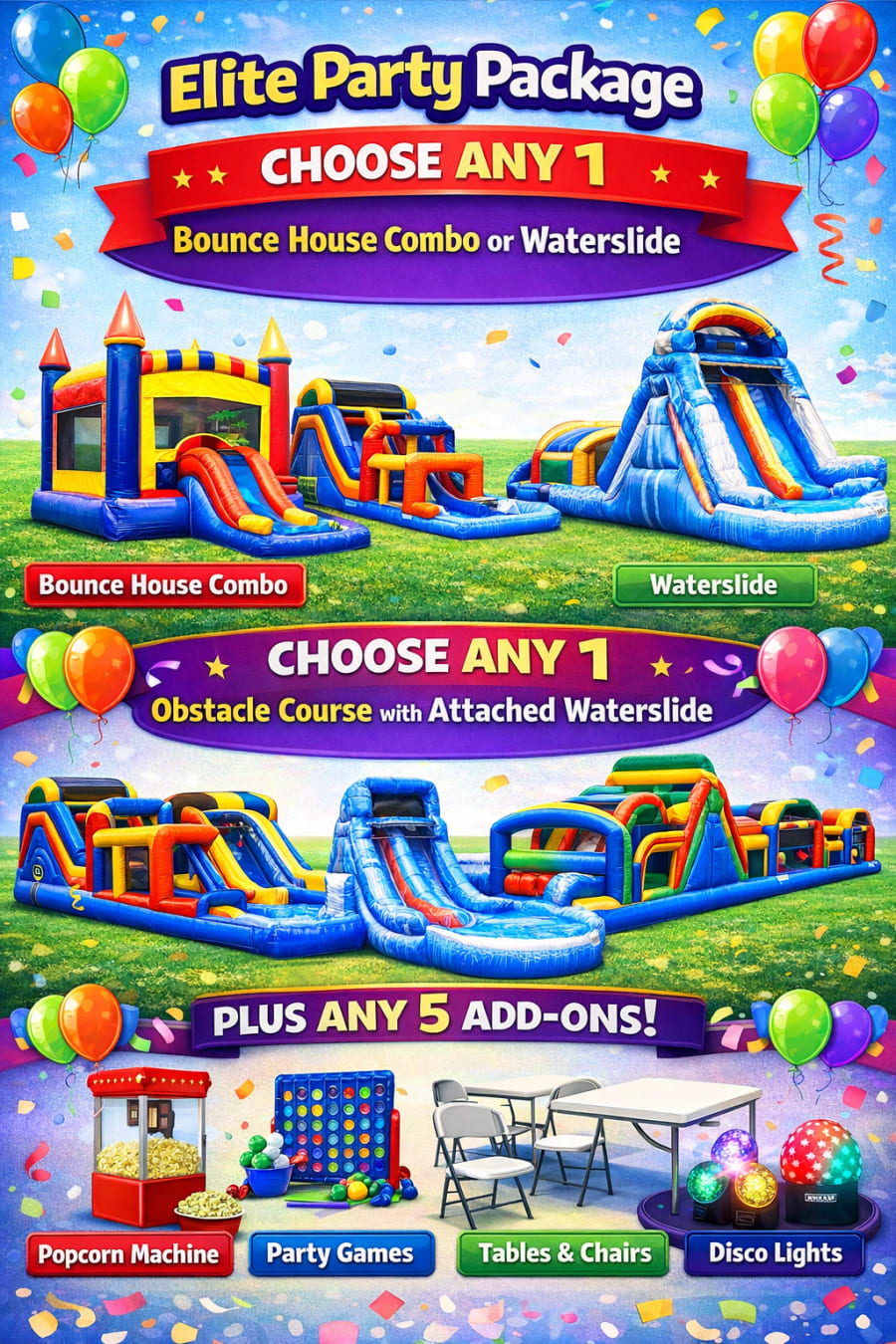 Take your event to the next level with our Elite Party Package! This all-in-one package includes your choice of 1 bounce house combo or waterslide, a 42 ft obstacle course with attached waterslide, plus any 5 add-ons for maximum fun.