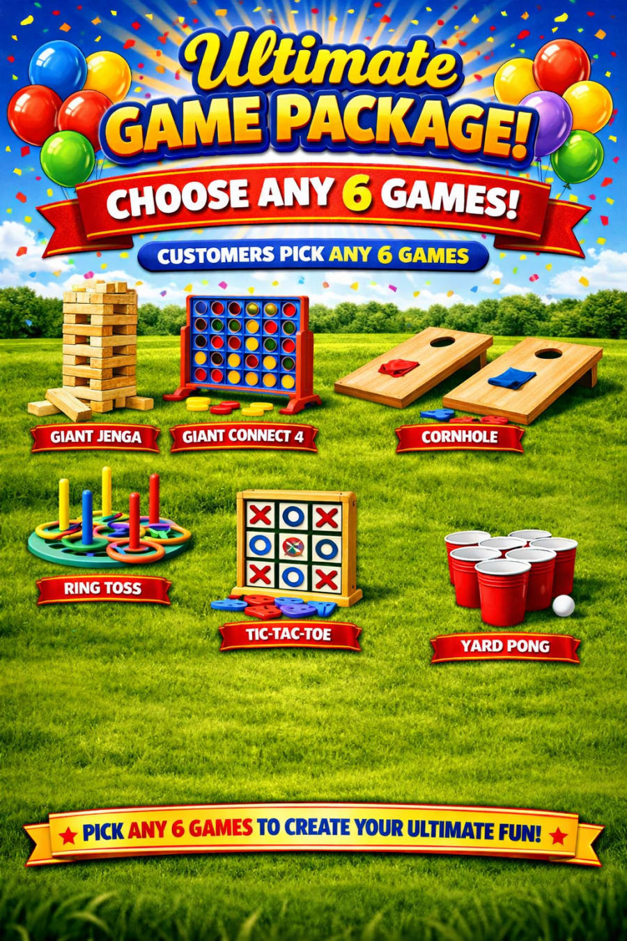 Turn any event into a fun-filled experience with our Ultimate Game Package – Choose Any 6! Select any six yard games to keep guests entertained at backyard parties, school events, corporate gatherings, and family celebrations.